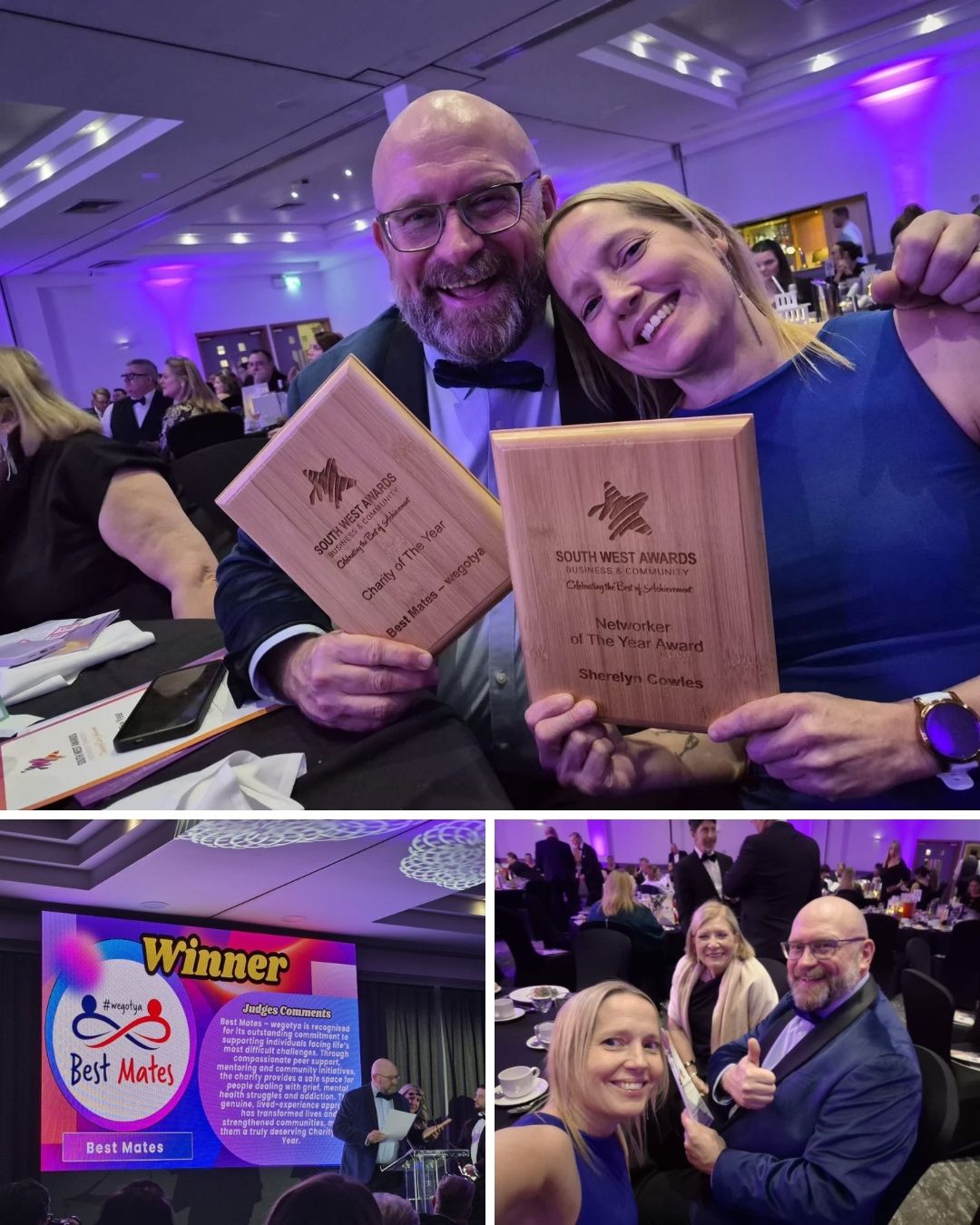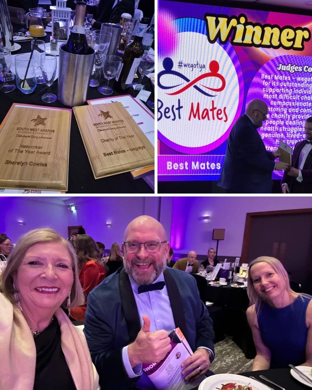 Last night, Jeff was joined by fellow colleagues from Best Mates, Sherelyn Cowles, one of our Walk N Talk leaders from Melksham, and Janet Shreeve of Shreeve Care Services at the South West Business Awards.